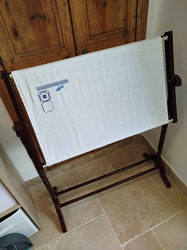 The project on it is a white and blue sampler. The pattern comes from my grandmother but I don't have the source. I'm still trying to find it and I will eventually.